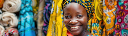 Joyful market browsing, vibrant African attire, glowing smile, colorful textiles