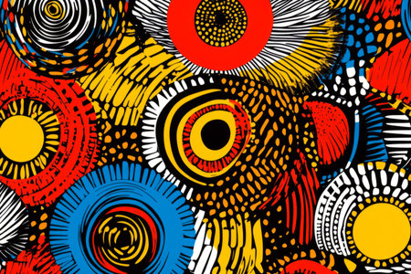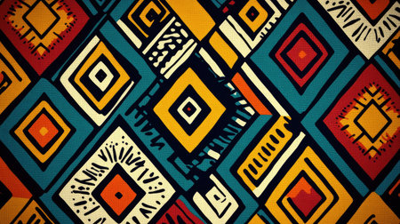 Seamless vibrant African wax print fabric, bold, geometric tribal patterns.