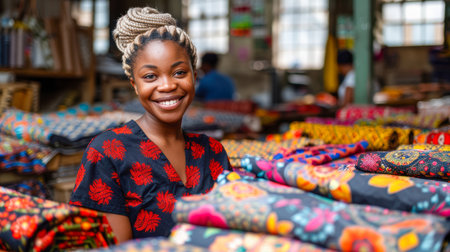 Smiling woman stands in a lively fabric market, surrounded by colorful textiles and intricate patterns, showcasing cultural craftsmanship.