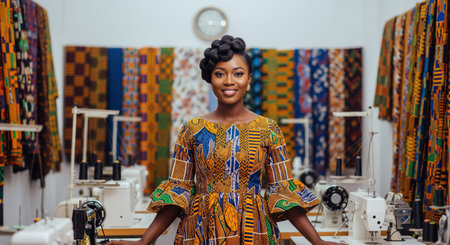 Portrait of a happy African fashion designer in her workshop with sewing machines and colorful fabrics, showcasing her small business.