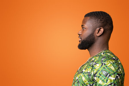 Interested african man in traditional costume looking at copy space over yellow background, panorama