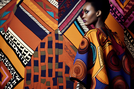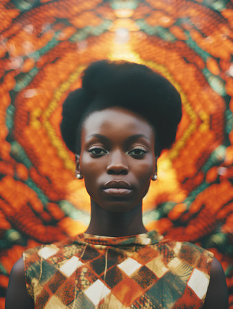 Young african female model posing with trendy fashion outfit and colorful vibrant orange optical art abstract background. Picturesque generative AI