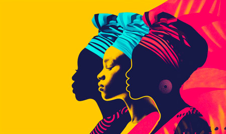 Three African women of varying skin tones are shown wearing headscarves in different colors. They are standing together, each with a unique expression on their faces, showing diversity in style and culture.
