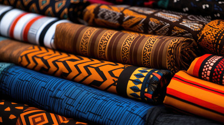 An array of fabric rolls adorned with intricate and colorful African designs, showing the rich cultural heritage and artistic flair of the continent.