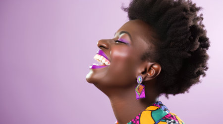 Black woman in Ankara headwrap, professional makeup, abstract background.