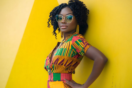Fashion model wearing a colorful traditional Ghanaian dress and sunglasses, posing against a vibrant yellow wall