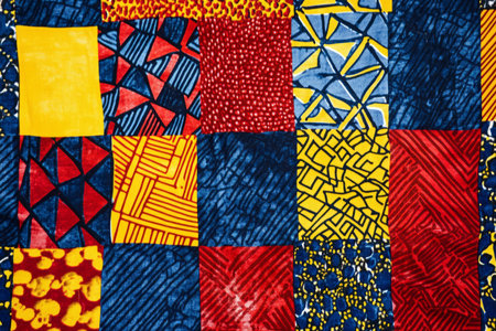 Bright African wax print textile, bold geometric patterns in red, yellow, and deep blue, creating rich cultural texture.