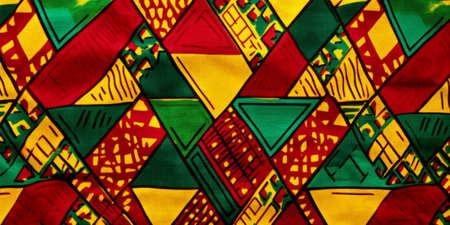 A vibrant African kente fabric texture background with bold geometric shapes in red, yellow, and green. The rich patterns and traditional weaving techniques create an authentic, cultural textile aesthetic, perfect for global fashion.