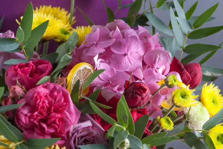 Beautiful bouquet of mixed colorful flowers of chrysanthemums, cloves and roses