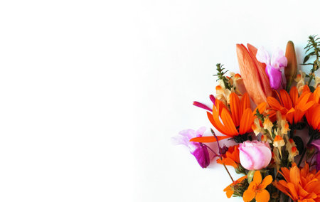 Background banner with colorful beautiful floral bouquet of garden flowers with copy space on a white background.