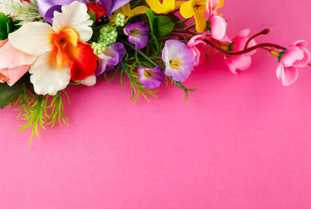 Flowers composition. Colorful artificial flowers on colorful background. Flat lay, top view, copy space