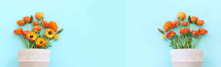Spring season concept, bouquet of beautiful flowers, banner size flat lay on a yellow background, copy space composition