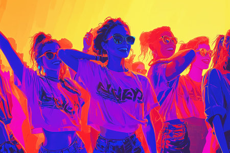 Two young women with bright makeup and stylish clothing standing in an urban setting with neon lighting. The concept of contemporary fashion and youth culture.