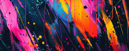 Random splatters of neon colors overlaid with jagged brushstrokes, resulting in an edgy, graffitiinspired style