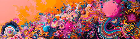 A dynamic, ultra-high-resolution abstract panorama that explores the fluidity of colors and shapes. This image is a riot of pink, orange, and blue hues, forming a visual feast that simulates a psychedelic experience or a vibrant alien landscape.