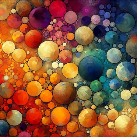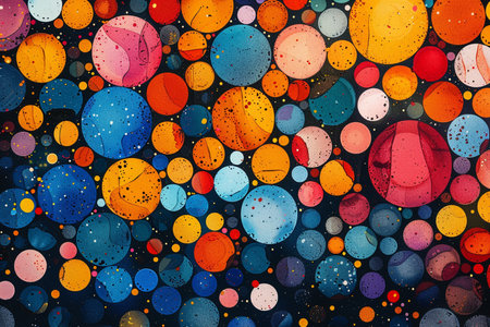 Brightly colored abstract artwork showcases a multitude of circles in various sizes and hues, creating a lively and dynamic composition on a textured background.