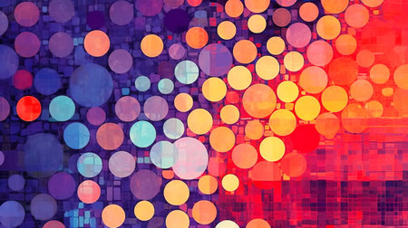A stunning geometric mosaic of circles and squares bursting with vibrant colors