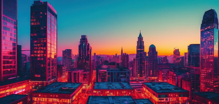 Futuristic skyline glows with multi colored skyscrapers at dusk generated by artificial intelligence