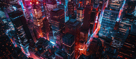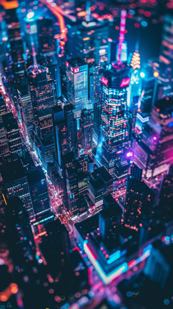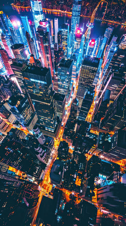 An aerial view of a busy city at night, bathed in a neon glow, with bustling streets forming a busy grid of city life. Night cityscape