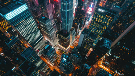 High angle view of modern city center with skyscrapers and illuminated streets at night.