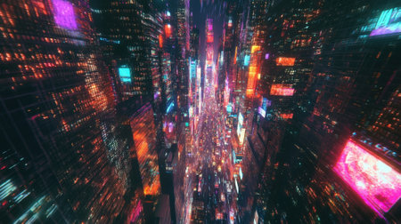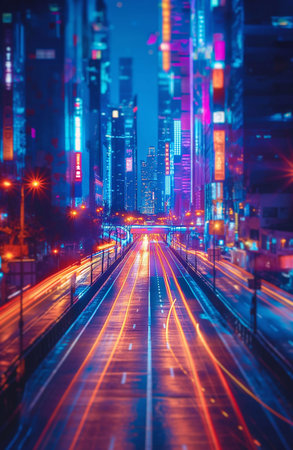 A stunning view capturing the essence of a vibrant city at night, showcasing the energetic motion of lights and skyscrapers amidst a dynamic urban atmosphere.
