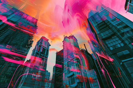 Digital glitches create a vibrant aesthetic in urban landscape of modern city