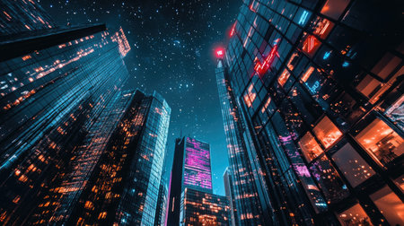 A panoramic view of a city skyline at night, with illuminated skyscrapers creating a dazzling display against the dark sky, symbolizing urban vibrancy.