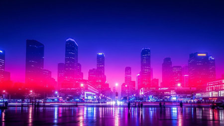 A city skyline is lit up in neon colors. The city is reflected in the water, creating a vibrant and lively atmosphere. The neon lights give the impression of a futuristic city, with tall buildings