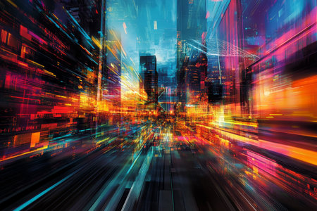 Long exposure of city lights with colorful motion trails, creating an abstract and vibrant representation of modern urban life.