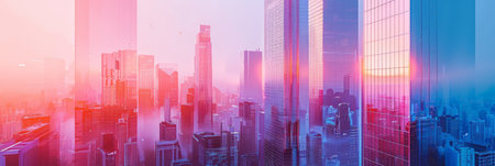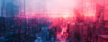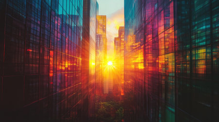 Sunrise over a futuristic cityscape with glass skyscrapers and vibrant colors. Modern urban architecture and corporate buildings