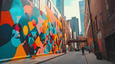 A vibrant urban mural fills the alley, showcasing bold colors and artistic expression amidst towering buildings.