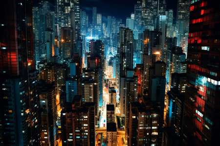 Experience the stunning city skyline from above, where bright neon lights create an electric atmosphere in the lively streets during the night.