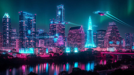 The image features a bustling city illuminated by neon lights against the dark night sky. Skyscrapers, streets, and highways are visible, with traffic flowing and buildings glowing. The cityscape is alive with activity as residents and visitors move through the urban landscape.
