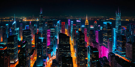City skyline glows with multi colored skyscrapers in the dark night generated by artificial intelligence