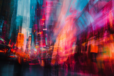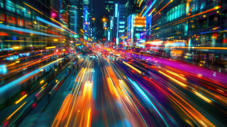 Long exposure of city lights with colorful motion trails, creating an abstract and vibrant representation of modern urban life.