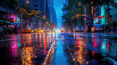 A vibrant nighttime cityscape showcasing a downtown urban landscape with colorful city lights reflecting on a wet pavement, creating a serene and captivating scene.