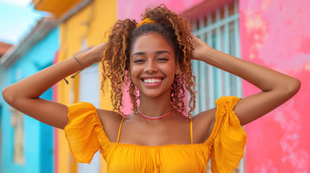 A beaming smile from a young woman in a pastel-colored top, standing before a rainbow-painted wall. The warm lighting enhances her natural beauty and the joyful ambiance of the photo. AI generation