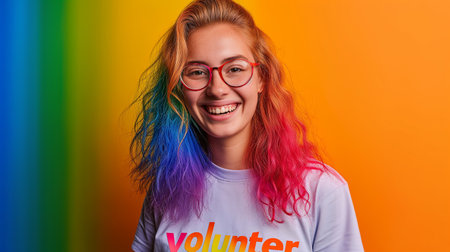 Young woman with vibrant rainbow hair smiles brightly against a colorful background in a cheerful indoor setting.