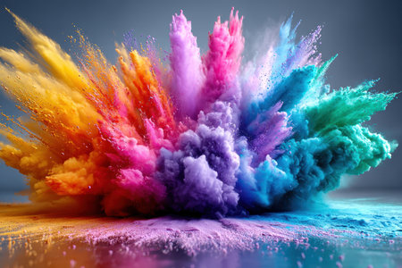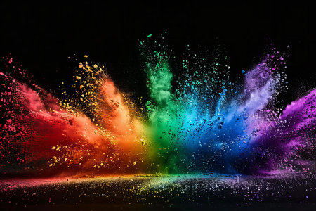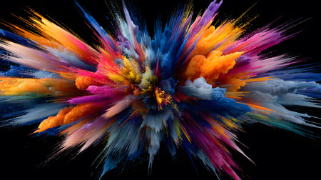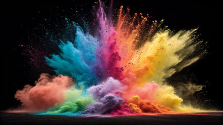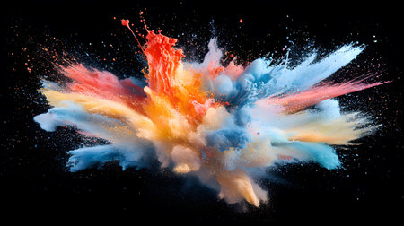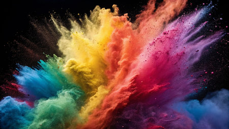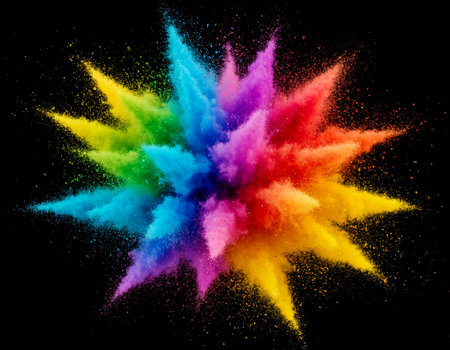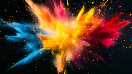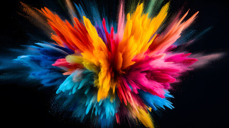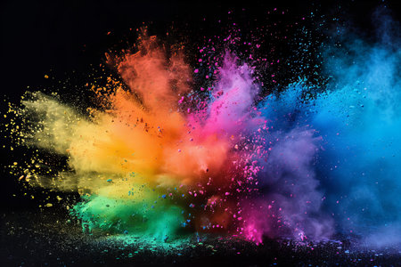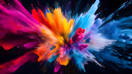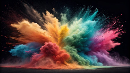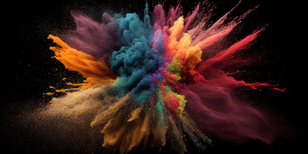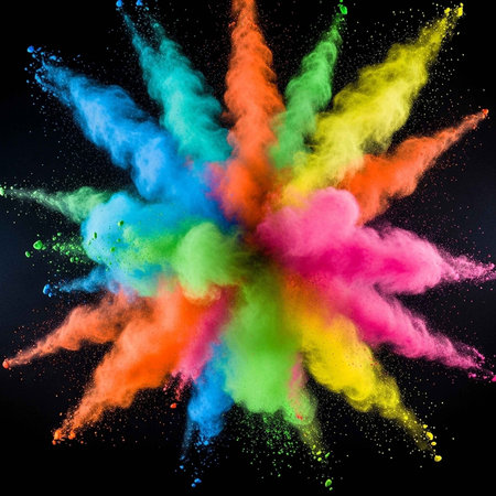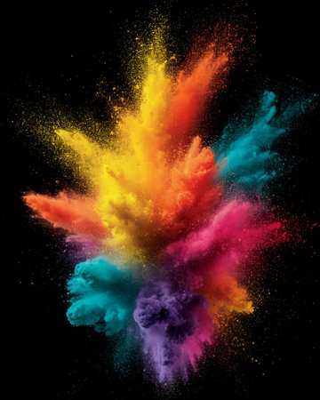 A vibrant explosion of colorful powder against a dark background