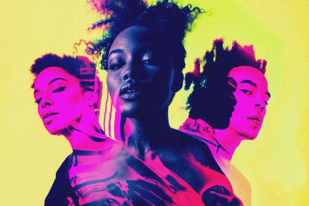 Three stylized portraits of young adults with afro hairstyles, overlaid and colorized in vibrant pinks, purples, and yellows against a bright yellow background. The central figure is most prominent.