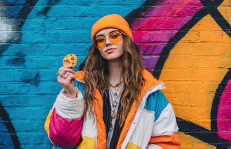 Portrait of a stylish young woman wearing orange sunglasses and a colorful jacket holding a chocolate chip cookie against a brick wall.