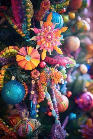 close-up of a beautifully decorated christmas tree with colorful ornaments, created with generative ai