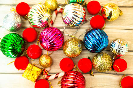 Lots of balls, gift box, candy sticks, decorative stuff, celebration decoration, christmas and happy new year background, Flat lay, top view.