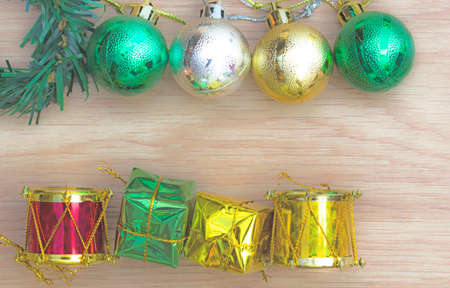 Christmas background with decorations and gift boxes on wooden