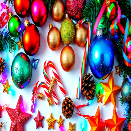 A vibrant scene showcasing a variety of colorful Christmas ornaments and ribbons shimmering against a glittery backdrop, perfect for holiday celebrations.