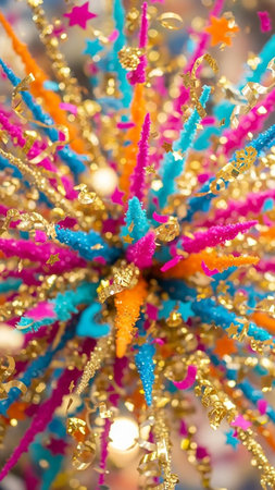 Vibrant showing vibrant explosion of colorful crystalline structures and gold glitter in a festive abstract burst with bright pink blue and orange keywords:...