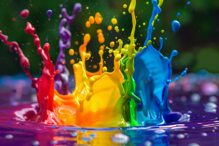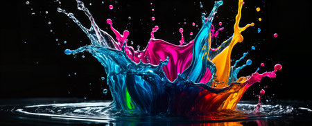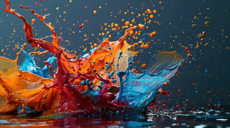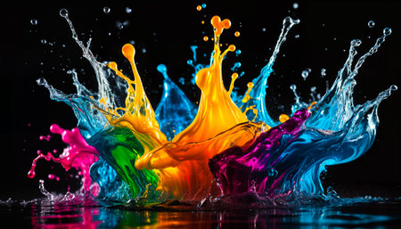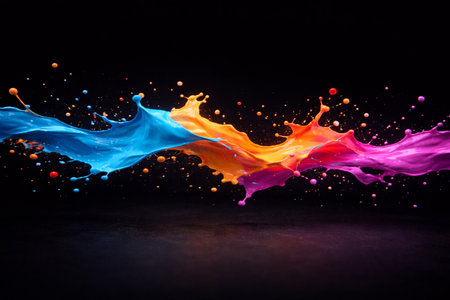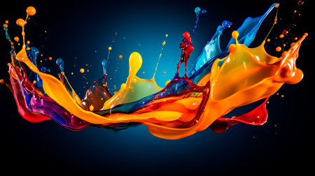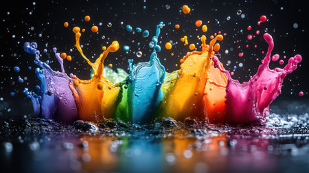 A vivid display of multicolored paint splashing against a dark background, creating a dynamic and energetic scene.
