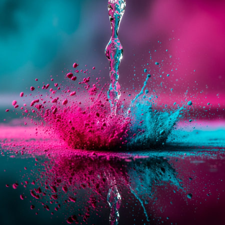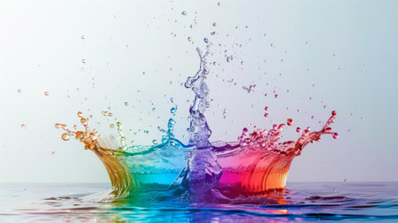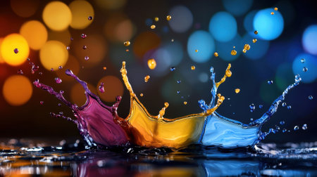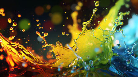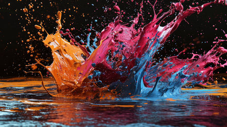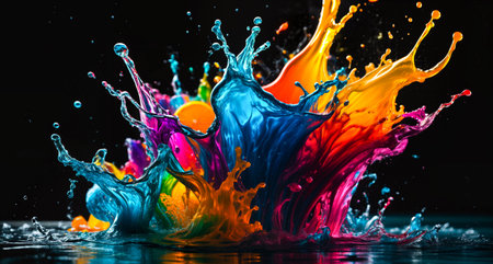 AI Generated. Dynamic splash of vibrant colors as water drops collide and scatter