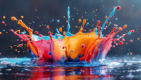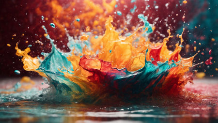Dynamic Paint Splash Explosion in Motion A high-speed capture of vibrant acrylic paint splashing mid-air in bold primary colors, frozen