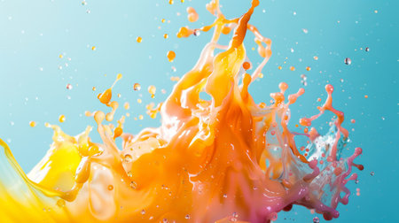 Dynamic and vibrant paint splashes in shades of yellow, orange, and pink against a blue background, creating an energetic and artistic visual.